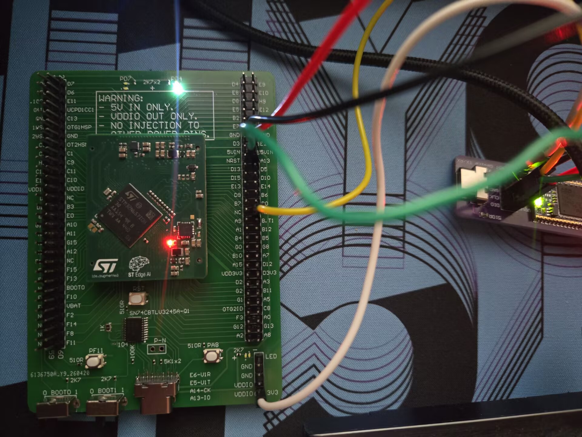 2025年中旬,为了验证STM32N6的NPU性能以及体验官方的Model Zoo生态,自制了一块STM32N6570核心板,结果因为工作忙加上没配IO板,在抽屉里吃灰了一年多。其实这块板子挺让人纠结,芯片贵、电路复杂、软件配置也麻烦,对于只是业余随便折腾的电子爱好者来说,在这些琐碎细节上耗精力实在不划算,所以一直不太想碰。但考虑到当初打板就花了一千五百多,直接扔了又太可惜,思来想去还是给它补了一块IO板,打算验证完外部存储器功能就彻底搁置,给它一个完整的生命周期。 相关文件已开源到github: [https://github.com/cl-ei/stm32n657i0-dev-board-hardware](https://github.com/cl-ei/stm32n657i0-dev-board-hardware) ## 一、硬件配置 主控STM32N657I0H3Q,板上晶振48Mhz,有一个低电平驱动的红色LED灯,连接PG10引脚。核心电压默认给到了0.89v,配置R30和R31可以调整到0.81v。Flash型号为MX66UW1G45GXDI00,1G bit(128MB),需要先焊接SB1将VDDA1V8供电输入到Flash芯片的VDD引脚。IO配置如下: ```cpp /* MX66UW1G45GXDI00 Pin Map */ #define FLASH_NCS PN1 #define FLASH_DQS PN0 #define FLASH_CLK PN6 #define FLASH_IO0 PN2 #define FLASH_IO1 PN3 #define FLASH_IO2 PN4 #define FLASH_IO3 PN5 #define FLASH_IO4 PN8 #define FLASH_IO5 PN9 #define FLASH_IO6 PN10 #define FLASH_IO7 PN11 ``` ## 二、启动过程 ### stm32N6 启动模式 系统复位后会执行内部的bootROM,启动模式依赖BOOT0、BOOT1引脚和一个TAMP backup register以及一个OTP(一次性编程)的word决定。BOOT1引脚默认为PA6。启动模式如下: | BOOT0 | BOOT1 | Boot source | |-------------------|---------------------|---------------------------| | - | 1 | Development boot | | 0 | 0 | Flash boot | | 1 | 0 | Serial boot | Serial boot即从串口或USB接口启动,不在讨论范围。Dev boot是开发调试时,调试器直接将代码搬到对应的内存地址进行执行;而Flash boot即从外部存储器启动,可以通过OTP配置启动方式,比如选择从SPI NOR Flash启动还是SDMMC等。 这里的OTP很坑,只能一次性编程,如果配置错了标志位,就可能导致启动时找不到对应外部设备而变砖,整块板子都会报废。好在芯片中有很多OTP是用户用途的,比如用来写入用户定义的序列号、秘钥等,可以先找一个无关系统功能的OTP word进行配置,以此熟悉配置过程。 ### FSBL 第一段引导加载程序(FSBL)是 STM32N6 微控制器启动流程中的关键组件。它负责初始化系统、配置硬件,并将应用程序代码从外部存储器加载至内部或外部存储器中执行。 当boot引脚拨到 0 0 时,这里有几种启动方式,分为两种类型,一是在内部SRAM上执行代码,二是在外部存储器上执行。 __启动流程__ 复位之后,bootROM会检查外部存储器中存储的的FSBL前1K byte的内容(签名,其实只有前512 byte有效,后512 byte为填充值),如果校验OK,则bootROM会将FSBL从外部存储器搬到内部SRAM中,然后跳转到SRAM中FSBL的起始位置(跳过1K byte的签名)开始执行,此时执行的就是内部SRAM的FSBL。 #### 在内部SRAM中执行代码 如果图简单,FSBL可以包括启动的配置(bootloader)和用户代码,即用户应用被包含在FSBL之内,采用上述的启动流程就可以运行。这里的好处就是,一旦进入到SRAM中的FSBL,则外部存储器可以完全移除或者断电,而且代码运行在内部sram中,速度也比较快。 但缺点是,FSBL被限制在512KB,除去1K的签名部分,只有511KB。如果用户代码大小超过了这个限制,就得另寻它法。除此之外,FSBL还抢占了宝贵的内部SRAM空间,虽然这个芯片宣称有4.2MB SRAM,但其中的2.2MB是直接挂载到NPU的,即CPU无法直接访问,可用的只有2MB,而FSBL的地址恰好在1~1.5 MB的位置,它将连续的2MB内存,切分成了两段。 #### 在内部SRAM中执行的FSBL中,搭载加载与运行(Load & Run)功能 此种模式是对前一种方式的优化,bootROM 从外部存储器获取FSBL,并加载到内部SRAM中运行,然后FSBL对外部存储器进行配置,并获取第二个存储在外部存储器的二进制文件(application code),并将它拷贝到内部SRAM。这第二个二进制文件加载完成之后,FSBL就跳转到SRAM的新位置执行(即application code所在SRAM的位置)。 这里的好处是,可以将applicaion搬到SRAM的任意合适位置,比如搬到SRAM末尾,这样就可以获得连续的1.5MB内存,灵活性很高。 这里有详细介绍: [How to create an STM32N6 FSBL load and run](https://community.st.com/t5/stm32-mcus/how-to-create-an-stm32n6-fsbl-load-and-run/ta-p/768206) #### 在外部存储器上执行代码 这里的不同点在于,在FSBL中直接将外部存储器配置为存储映射模式(Memory Mapped Mode),跳转到外部存储器application的代码地址进行执行。 这将彻底释放内部SRAM。此时,我们需要生成两个文件,一个是FSBL,可以把它视作bootloader,它必须包含有效的文件头或签名,烧录到外部存储器映射后的首地址;另一个是application,是用户代码,烧录到外部存储器的其他位置,只要不与FSBL重叠就行(推论一)。 参考 [How to execute code from the external serial NOR using the STM32N6](https://community.st.com/t5/stm32-mcus/how-to-execute-code-from-the-external-serial-nor-using-the/ta-p/771048) ## 三、在外部存储器上执行代码的验证 分为以下几步执行: 1. 创建工程。__这里有一个踩坑的点,后续分析__,创建工程有两个选项:“Secure and Non Secure Domains” 和 “Secure domain only”,如果选择前者会创建两个application,分别是NS和S。这个选项确定是否启用硬件级的 TrustZone 安全隔离技术,这里是选定了“Secure and Non Secure Domains”。 2. 配置LED灯,context选择 Application。 3. 配置XSPI Flash,由于n657i0只有1个xspi端口,这里选择XSPI2 to Port2, 1 & 3 not used。XSPI2的配置如